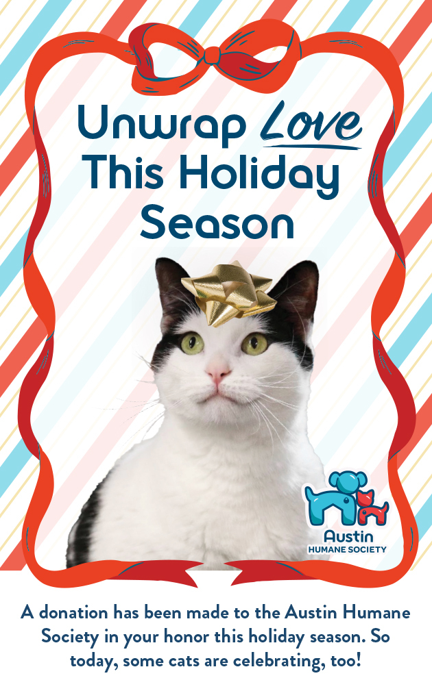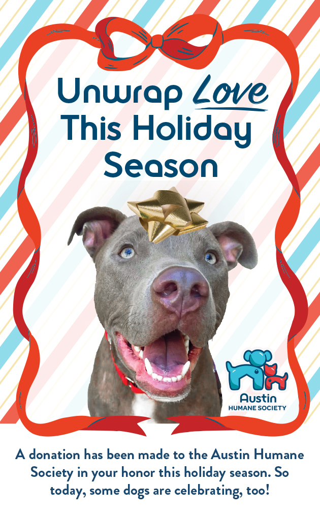 Show your love and give back at the same time by sending an e-Card benefitting the animals of the Austin Humane Society. There is a design for almost any occasion (holidays, birthdays, sympathy, weddings, and more!). Choose an e-Card below to notify someone of your donation in their name or in memory of a family member, friend, or pet. You can personalize your card and send or print – it’s as easy as that!